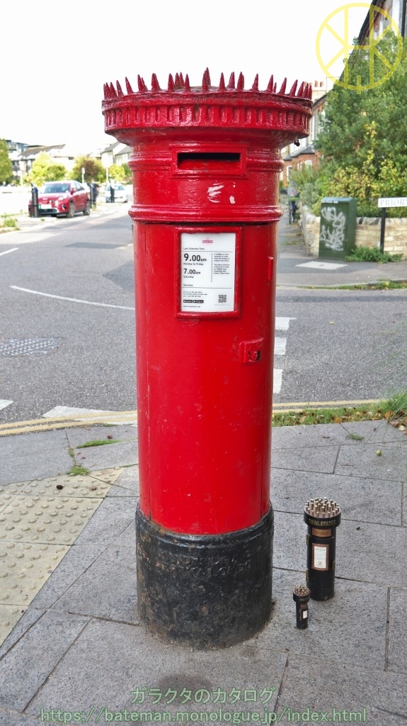 (8-10) 郵便局にはピラーボックスやウォールボックスなどの赤いポストとは全く違うものが設置されている例もあります。あまり面白みがないように見えますが、実は年代物が転がっていることもあります。中には、設置当時の国王の紋章が付いているものもあるようです。