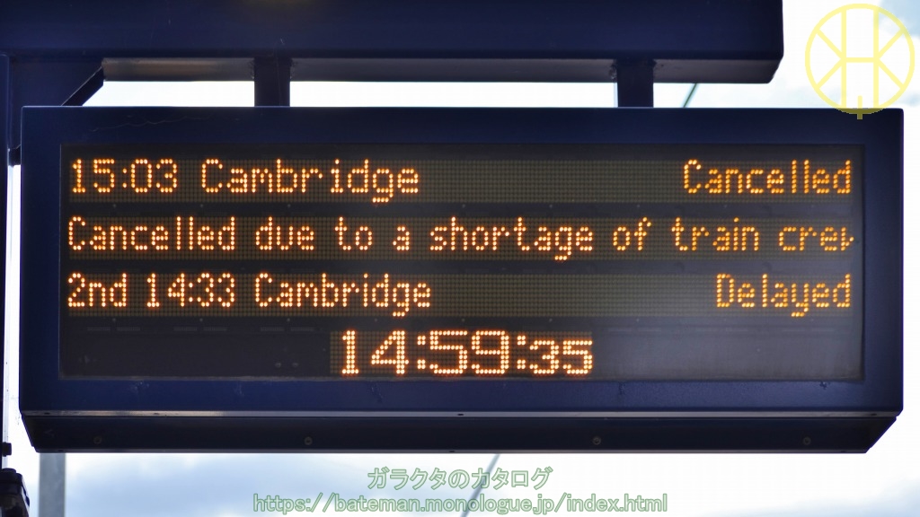 「日本でも京急で時々聞くじゃないか」って?いやいや、とんでもない。京急なら「乗務員手配」で遅れるとしてもせいぜい数分ですが、イギリスでは"this trains is delayed by 20 minutes due to waiting for a train crew member"なんてザラです。そして、結構な確率で"cancelled due to a train crew member being unavailable"となります。